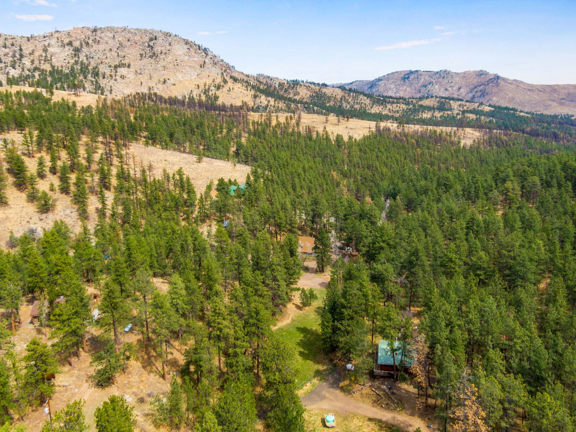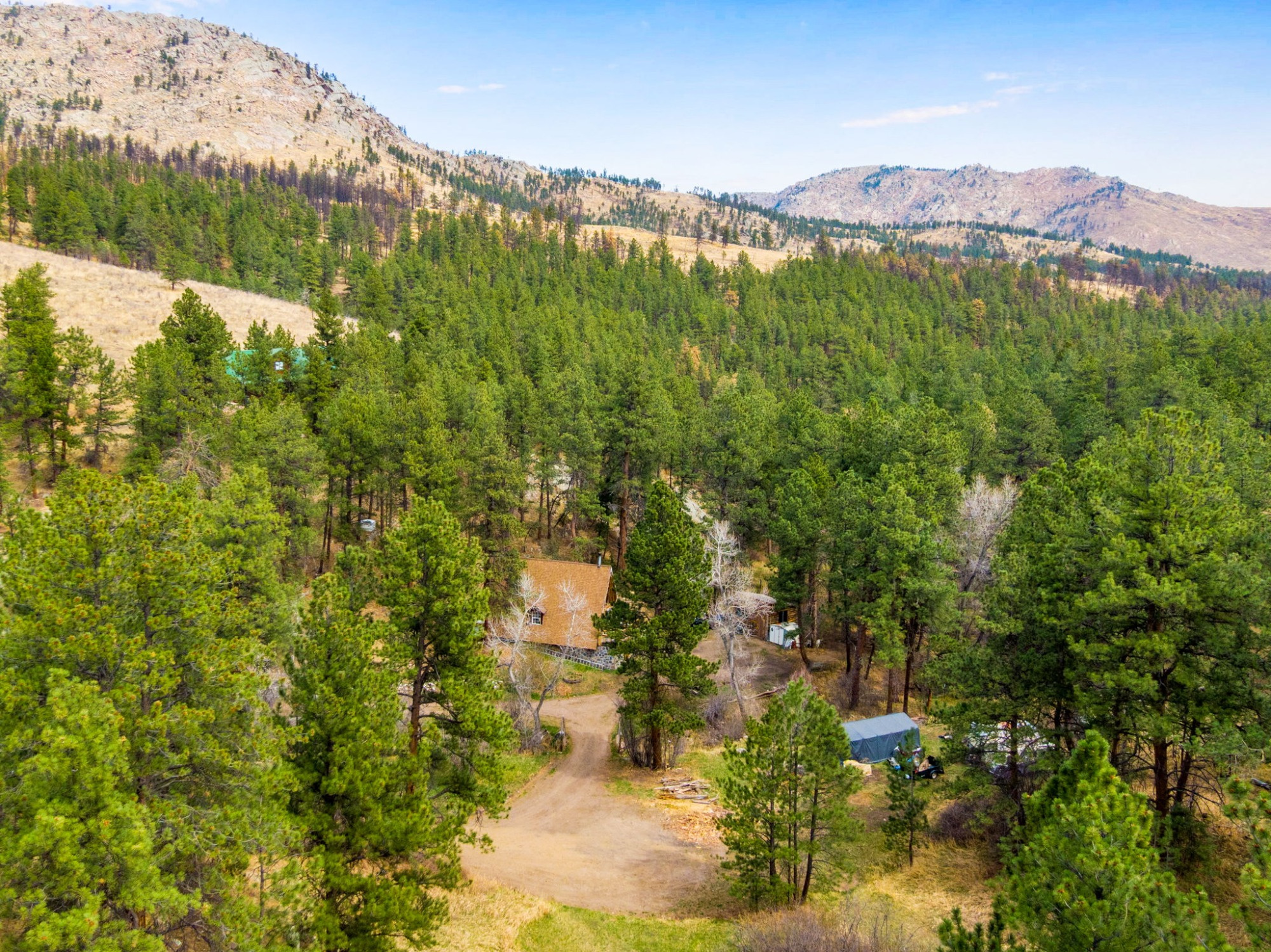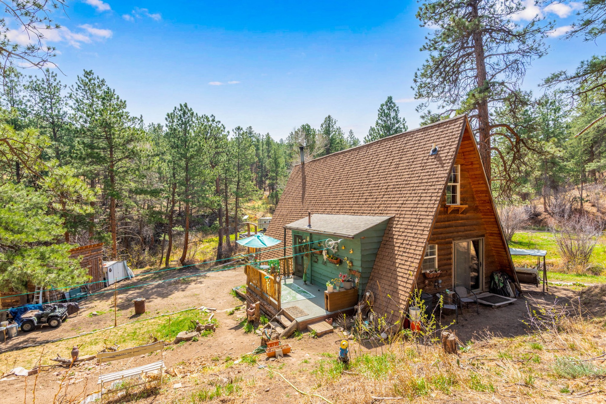 A private half-mile trail leads to a secluded lake and seasonal cascades, while National Forest access sits less than half a mile away. Additional features including supplemental solar, a workshop/shed, forced-air heating, and year-round road access make this a true all-season retreat.