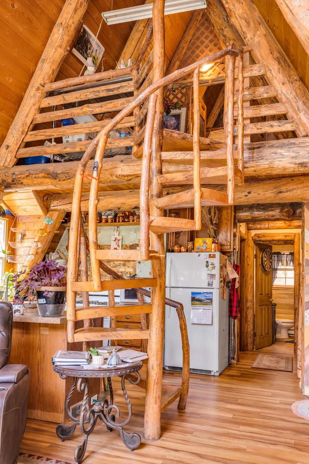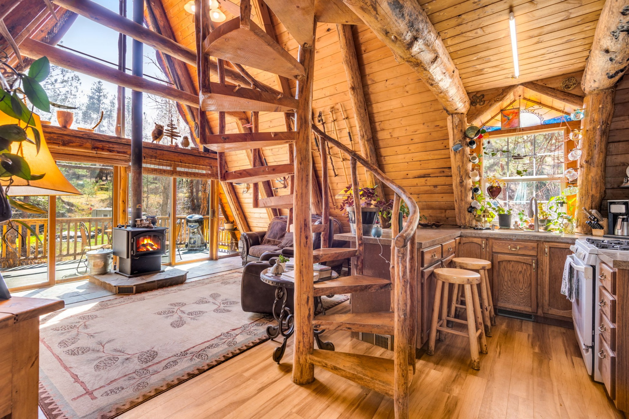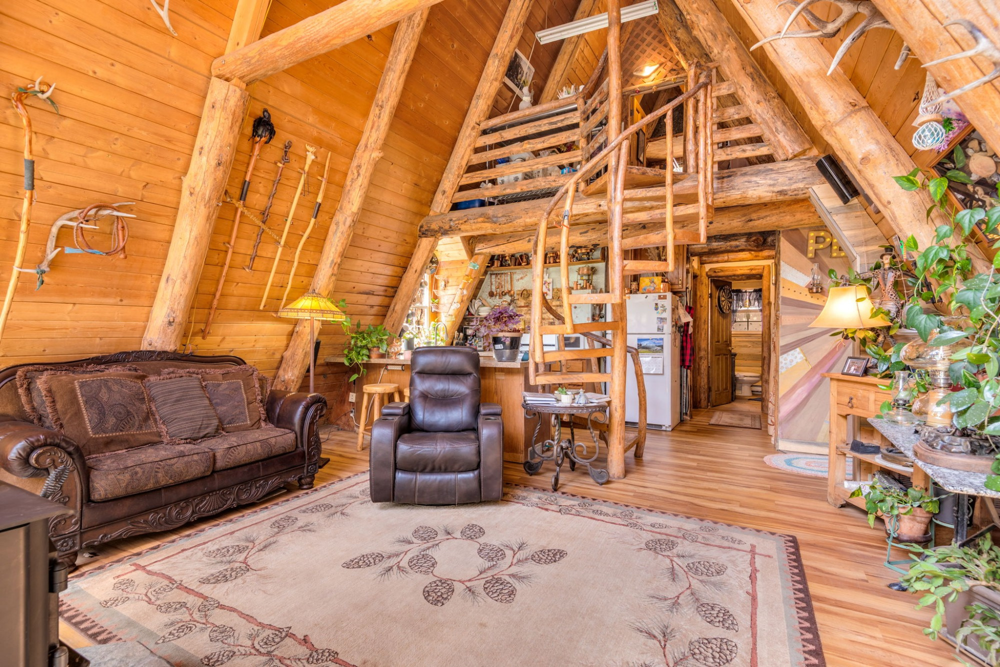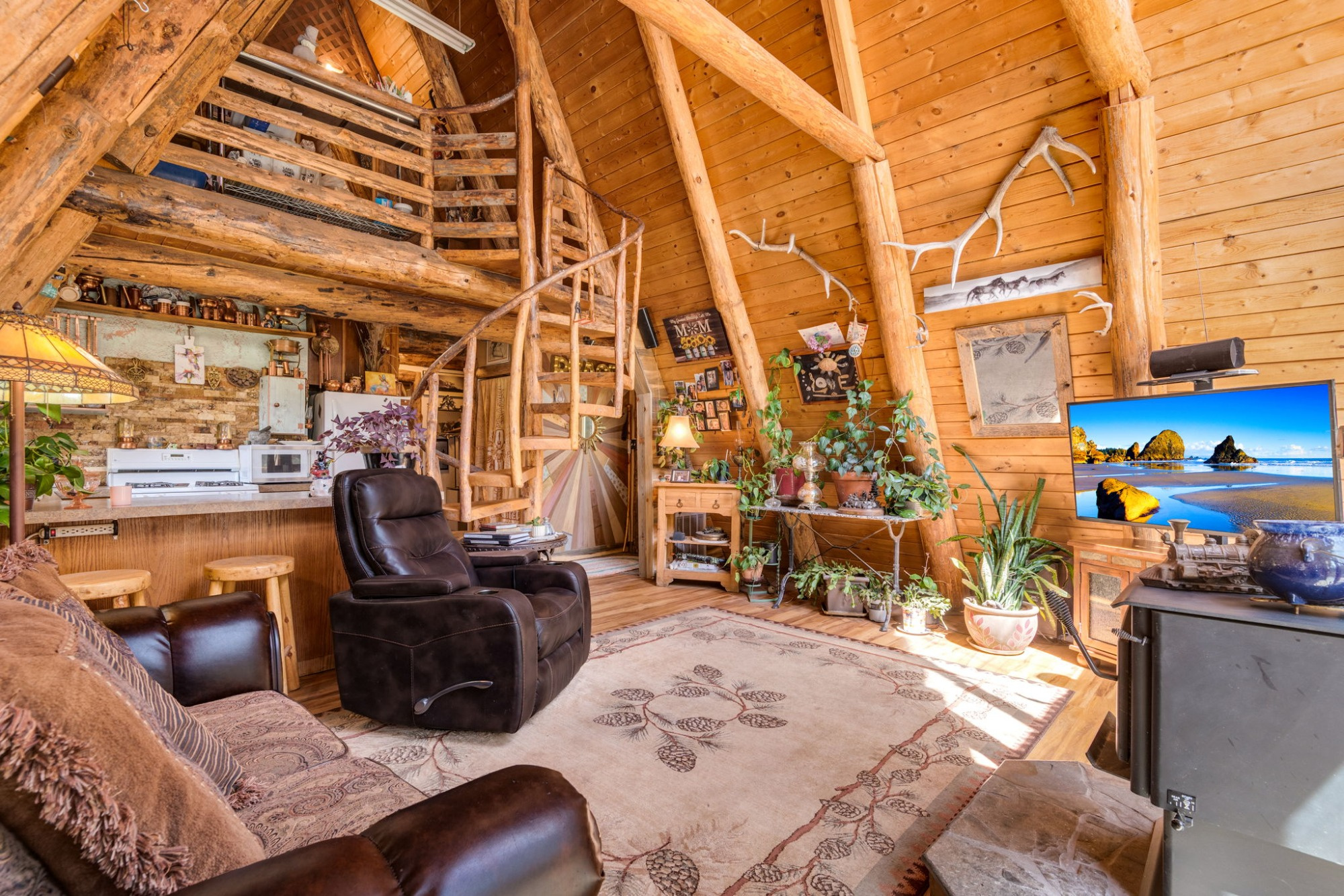 Inside, the home lives far larger than its 834 square feet, with soaring vaulted ceilings, warm wood accents, an open-concept layout, and a lofted upper level that gives the home its iconic cabin feel.