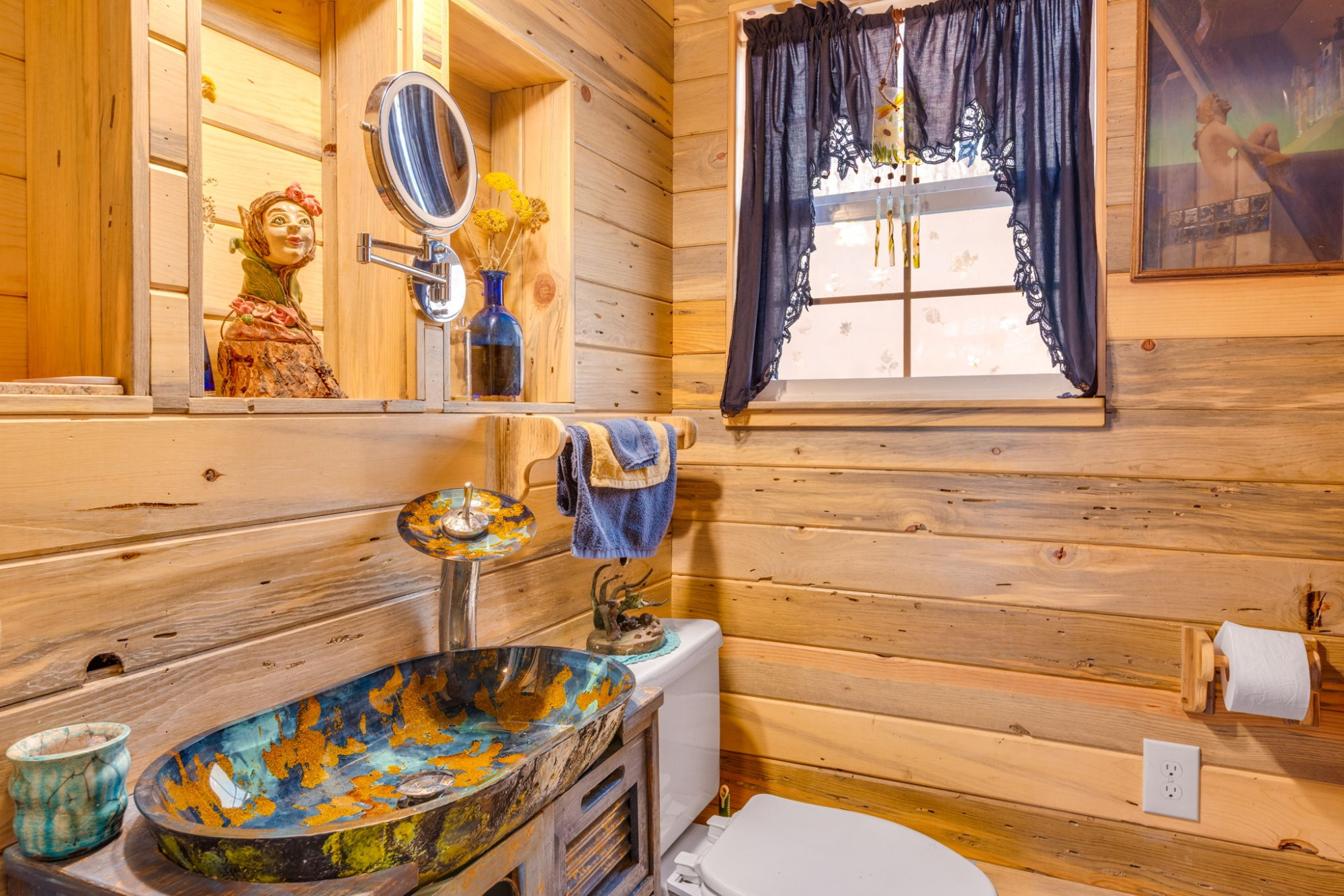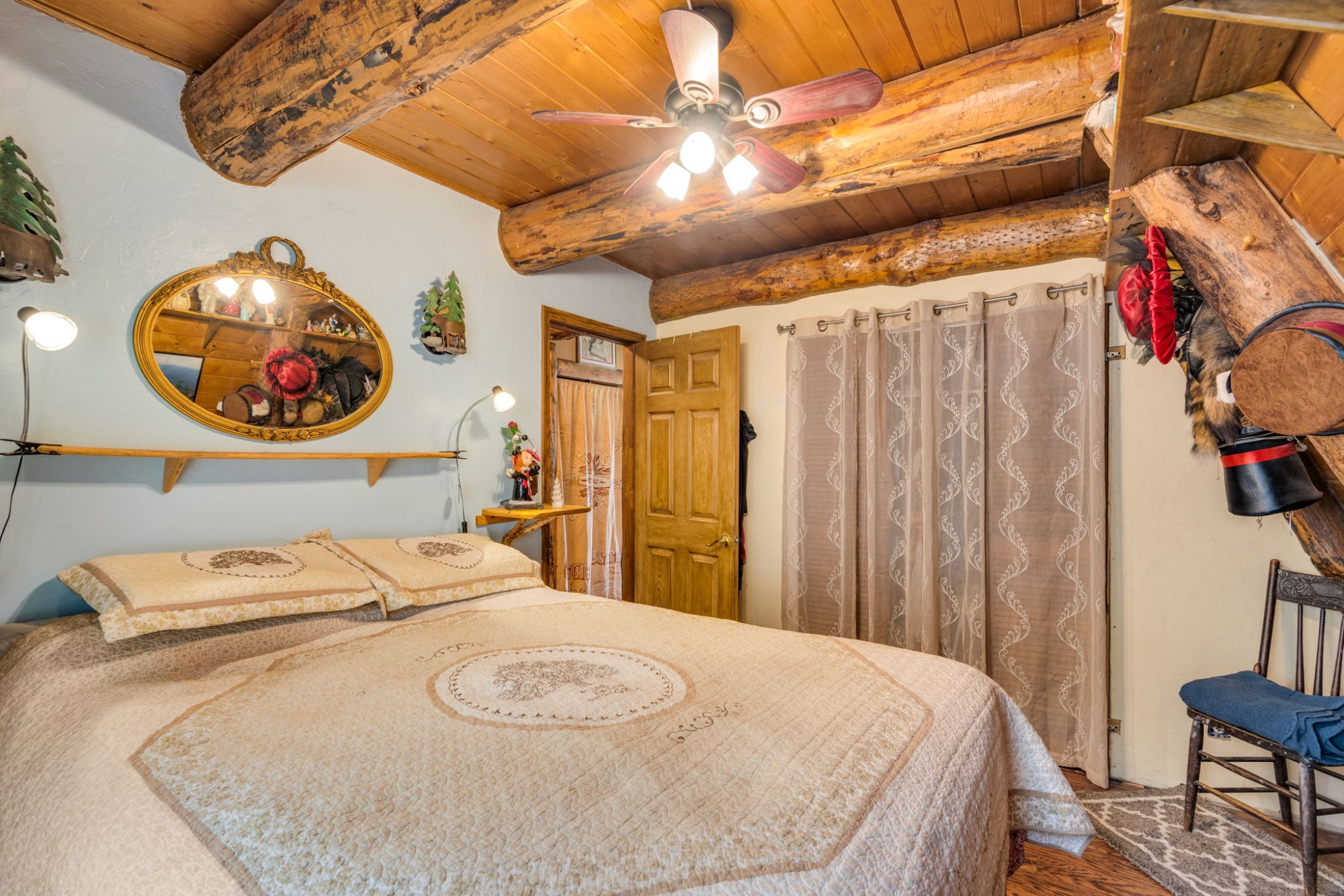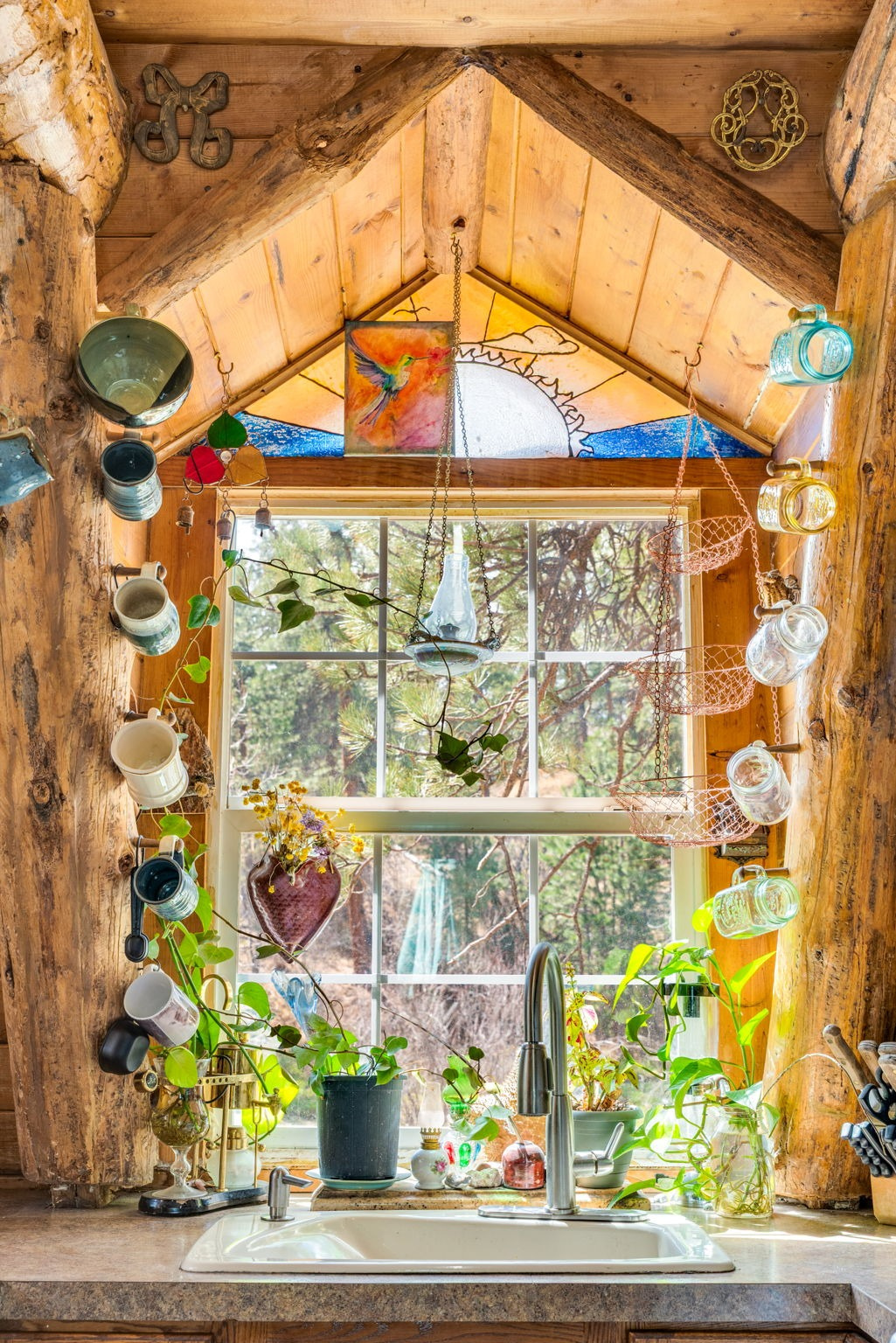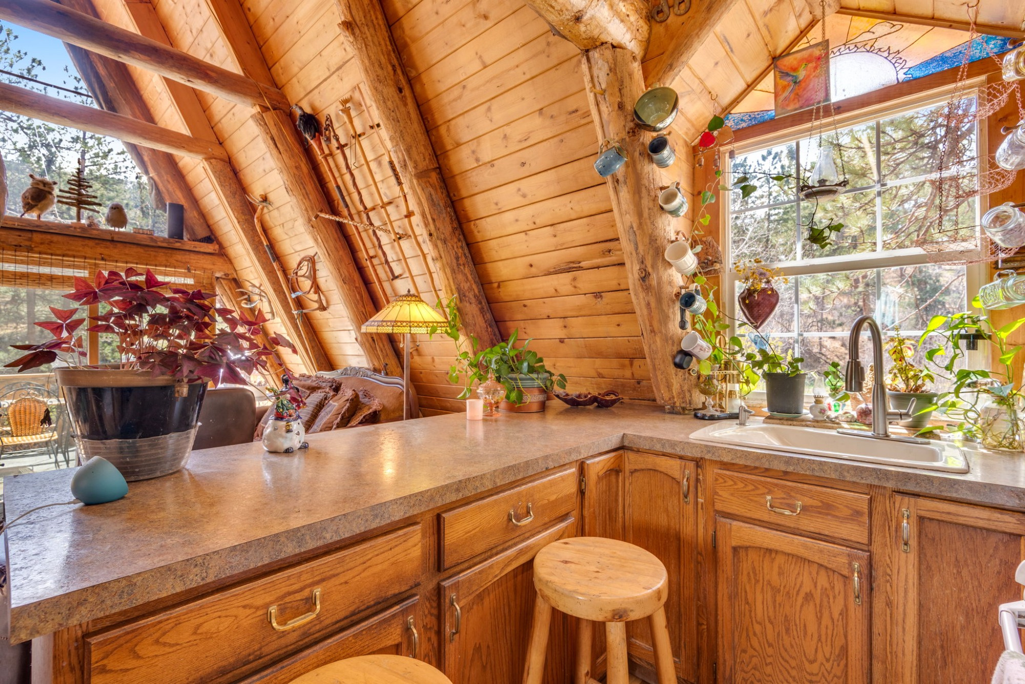 Inside, the home lives far larger than its 834 square feet, with soaring vaulted ceilings, warm wood accents, an open-concept layout, and a lofted upper level that gives the home its iconic cabin feel.