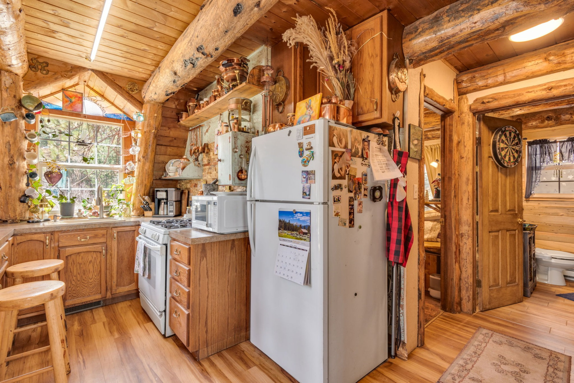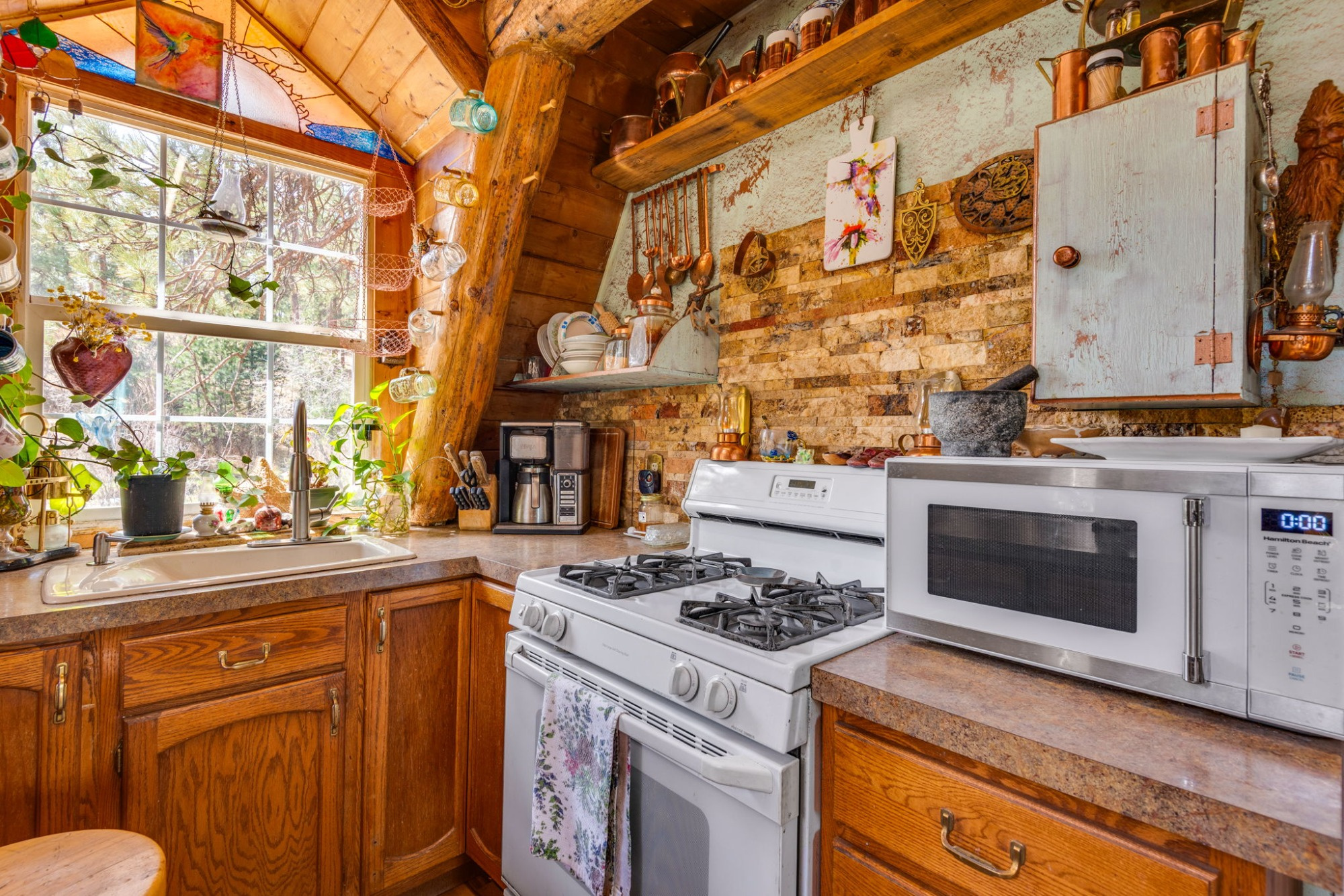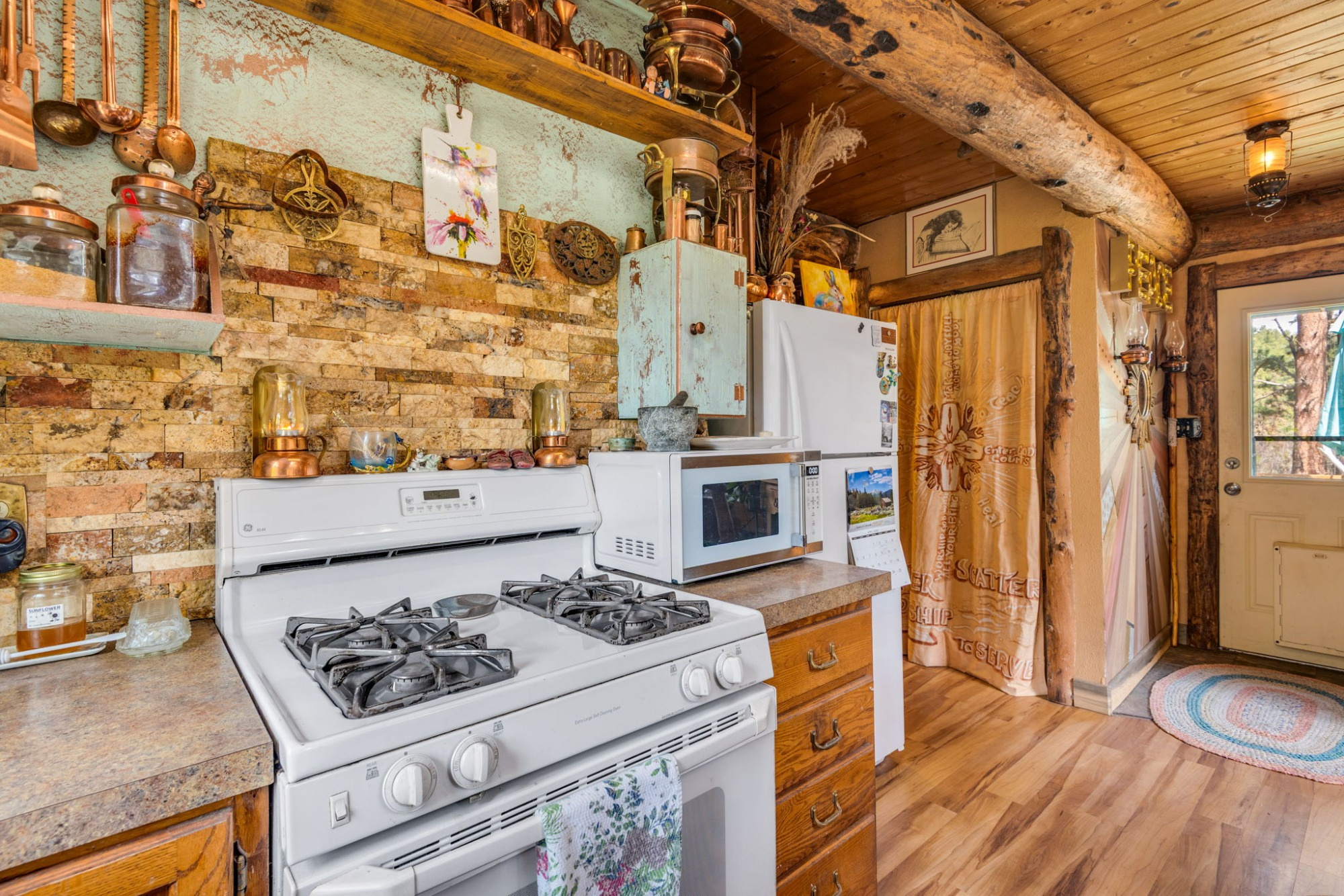The updated kitchen, remodeled bath, natural stone hearth, and high-efficiency Quadra-Fire wood stove create the perfect balance of rustic charm and modern comfort.